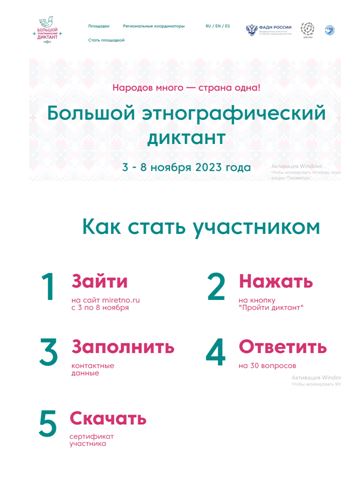 Подробную информацию о Международной просветительской акции «Большой этнографический диктант» можно узнать на сайте: www.miretno.ru