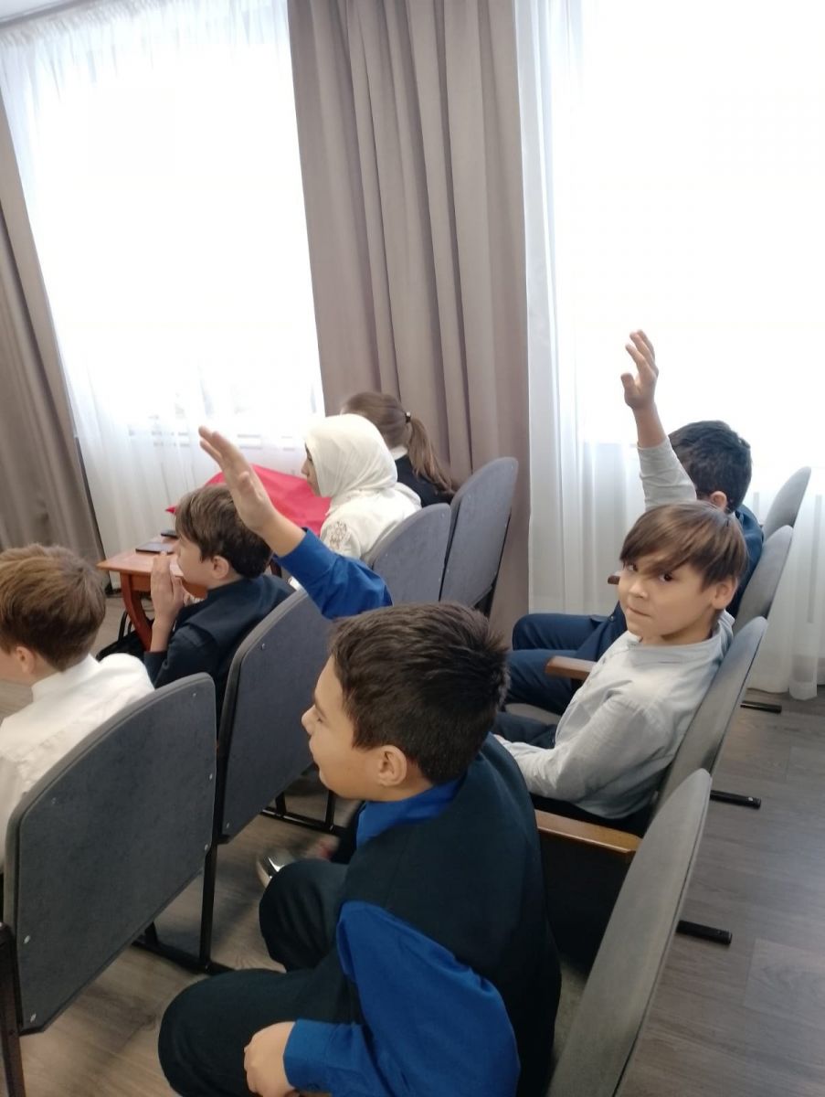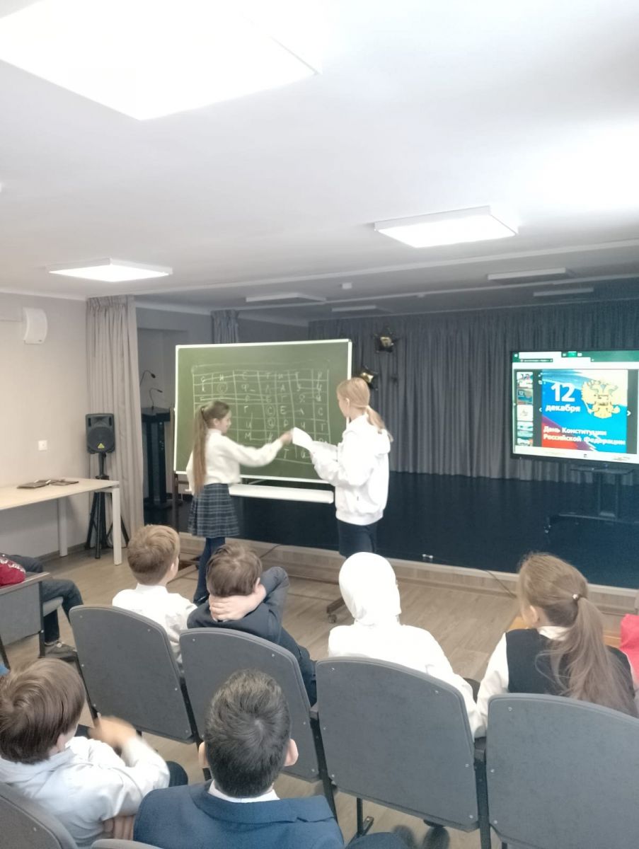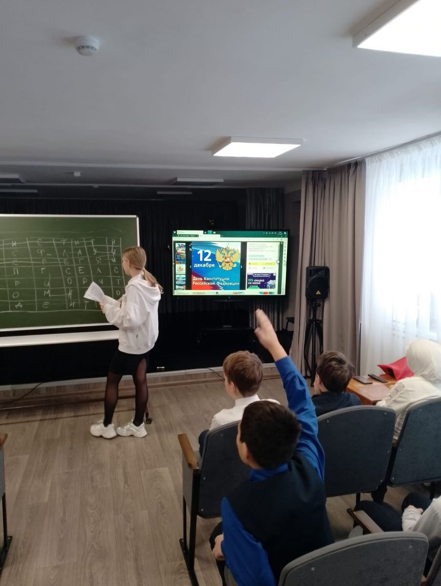 9б сыйныфы укучысы Шакирова Алия 5 сыйныфлар өчен Россия Федерациясе Конституциясе көненә багышланган интеллектуаль уен үткәрде.