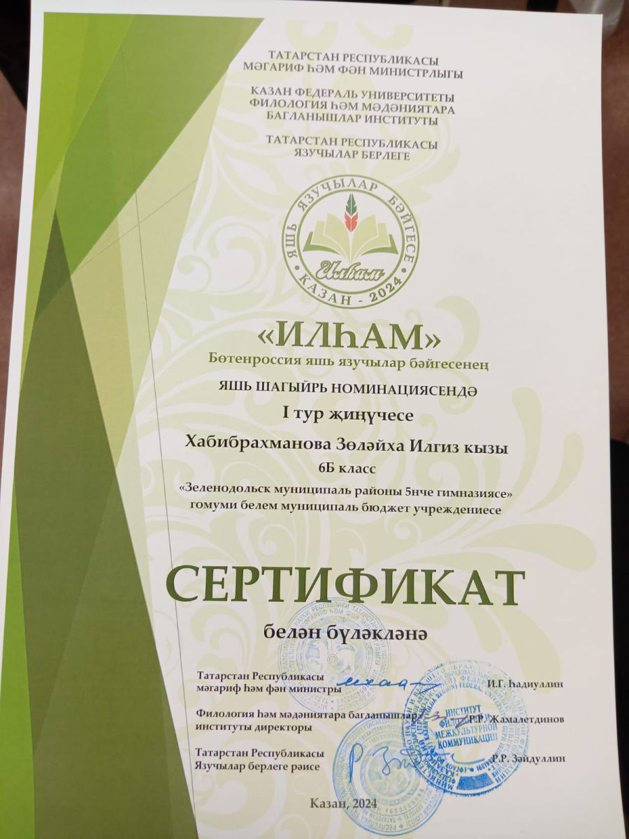 Опубликовано: 23.03.2024«ИЛҺАМ» Бөтенроссия яшь язучылар бәйгесенең Яшь шагыйрь номинациясендә I тур җиңүчесе Хәбибрахманова Зөләйханы котлыйбыз! Поздравляем!