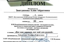 Наша ученица 9 класса Зиятдинова Алия участвовала в XI Республиканском конкурсе научно-исследовательских, проектных и творческих работ учащихся 4-9 классов на основе естественно-научных дициплин "Я выбираю село" и заняла III место. Поздравляем!