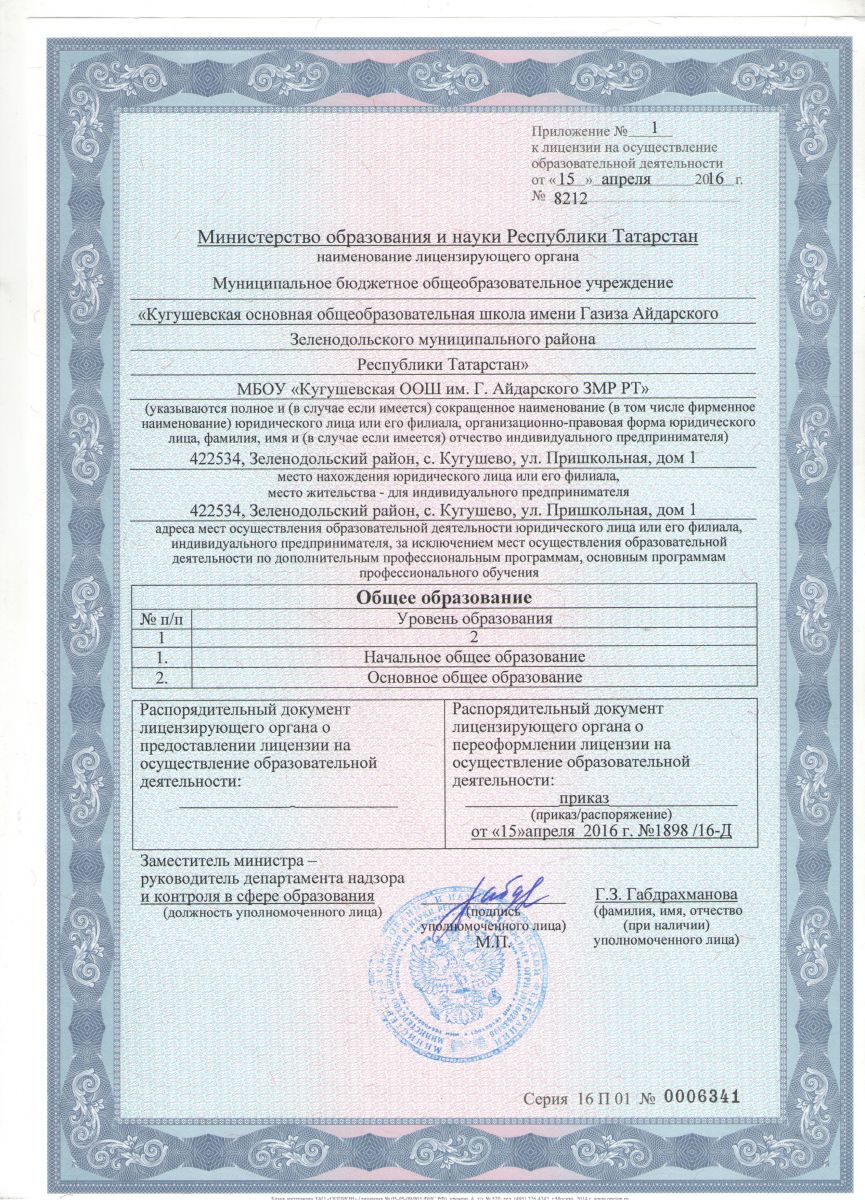 Лицензия МБОУ "Кугушевская ООШ им.Г.Айдарского ЗМР РТ" (Приложение)