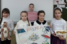 Нашему 1-му экипажу досталась Австралия. Мы нарисовали красочный плакат о стране и ее достопримечательностях, принесли атрибутику этого государства: игрушку кенгуру, изображение розового озера Хиллер и т.д. В Австралии на Новый год очень популярна пиротехника. На столе — оригинальные блюда, например пирог «Поплавок», который подают плавающим в супе-пюре.