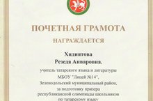 Ученица 9Б класса Загидуллина Айгуль стала призером Республиканской олимпиады по татарскому языку и татарской литературе. Учитель татарского языка Хидиятова Р.А. награждена Почетной грамотой МО и Н РТ за подготовку призера Республиканской олимпиады по татарскому языку и татарской литературе. Поздравляем! Молодцы!