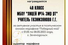 Учащиеся 2А и 4А классов (классный руководитель Г.Г.Газимзянова) приняли активное участие в IV поэтическом онлайн марафоне «Победный май!» 08.05.2022