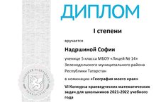 Поздравляем Надршину Софию, ученицу 5Б класса (руководитель Р.И.Шарипова) - победителя VI Конкурса краеведческих математических задач для школьников в номинации «География моего края» 25.04.2022