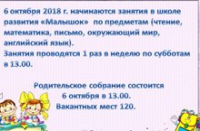 6 октября 2018 г. начинаются занятия в школе развития "Малышок" по предметам (чтение, математика, письмо, окружающий мир, английский язык).