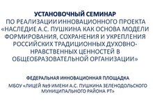 26.02.2024 на базе МБОУ «Лицей № 9 им.А.С.Пушкина г.Зеленодольска в рамках РЕАЛИЗАЦИИ Федеральной инновационной площадки по теме «НАСЛЕДИЕ А.М. ПУШКИНА КАК ОСНОВА МОДЕЛИ ФОРМИРОВАНИЯ, СОХРАНЕНИЯ И УКРЕПЛЕНИЯ РОССИЙСКИХ ТРАДИЦИОННЫХ ДУХОВНО-НРАВСТВЕННЫХ ЦЕННОСТЕЙ В ОБЩЕОБРАЗОВАТЕЛЬНОЙ ОРГАНИЗАЦИИ» (Приказ Минпросвещения №1056 от 28.12.2023) прошел УСТАНОВОЧНЫЙ СЕМИНАР с участием членов координационного совета, исполнителей и соисполнителей инновационного проекта.