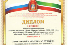 Лицею вручен Диплом 2 степени Всероссийского конкурса "Растим патриотов России", посвященного 75-летию Победы советского народа в Великой Отечественной войне 1941-1945 гг. Это достижение всего педагогического и ученического коллектива! Поздравляем!