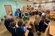 Дед Мороз и Снегурочка от имени школьного отряда регионального движения "Волонтеры Победы" поздравили первоклассников с Новым Годом.