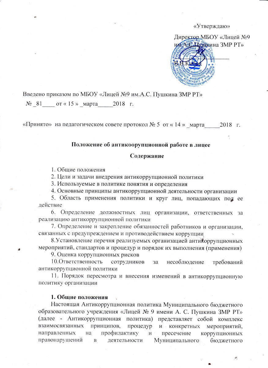 Положение об антикоррупционной работе лицея
