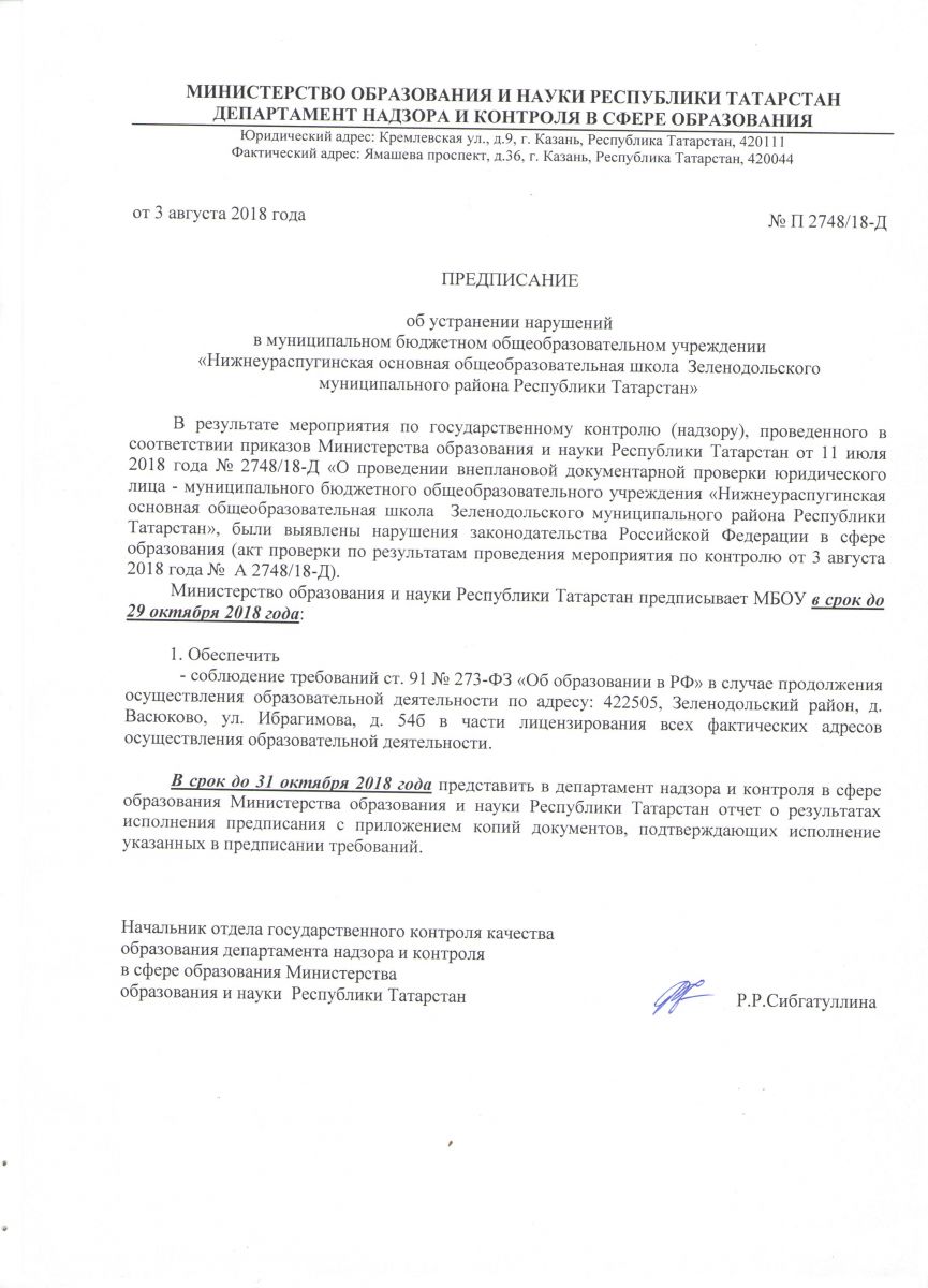 Предписание Департамента надзора и контроля в сфере образования МО и НРТ от 3 августа 2018 года № П 2748/18-Д