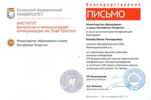 25 января, в «Татьянин день», в Институте филологии и межкультурной коммуникации им. Льва Толстого Казанского федерального университета учителю русского языка Обсерваторской СОШ Коновой Юлии Геннадьевне было вручено Благодарственное письмо от Министерства образования и науки Республики Татарстан и Оргкомитетa XIV Всероссийской научно-практической конференции «Литературоведение и эстетика в ХХI веке» (Татьянин день»), посвященной памяти Т.А.Геллер за подготовку научного доклада ученика- победителя Николаевой Надежды, ученицы 8 класса нашей школы, которая была награждена Дипломом по секции «Новейшая литература».