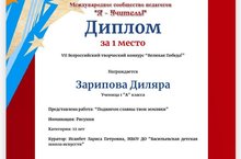 Поздравляем ученицу художественного отделения Васильевской ДШИ Зарипову Диляру с победой в VII Всероссийском творческом конкурсе «Великая победа» Диплом за I место.Преподаватель Исанбет Л.П. Желаем дальнейших творческих успехов!
