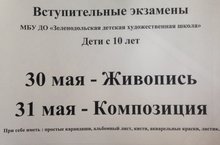 Вступительные Экзамены!!! Дети с 10 лет; 30 мая - Живопись, 31 мая - Композиция; В 9.00 для второй смены и в 14.00 для первой смены; При себе иметь : простые карандаши, альбомный лист, кисти, акварельные краски, ластик. Адрес: г.Зеленодольск, ул.Засорина, 4А 07.05.2018