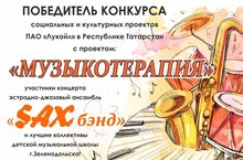 28 мая 2019 года в Концертном зале Детской музыкальной школы состоялся концерт «Музыкотерапия». Школа является победителем в конкурсе культурных и социальных проектов в номинации «Духовность и культура» ПАО Лукойл в Республике Татарстан с проектом «Музыкотерапия». Эстрадно-джазовый ансамбль Сакс-бенд – коллектив, с которым организован концерт в рамках этого проекта. В концерте также приняли участие Хор старших классов «Созвездие», Ансамбль скрипачей младших классов, солисты- вокалисты и инструменталисты. В программе вечера зрителей ждал приятный сюрприз (выступление фокусника), организованный при поддержке Совета отцов Зеленодольского муниципального района, в состав которого входит директор Детской музыкальной школы А.С.Попов. Слушатели также стали участниками импровизированной интерактивной игры, в которой за правильные ответы, связанные с музыкой, вручались значки с надписью «Музыкотерапия».