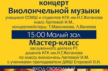 В 15.00 в Малом зале Мастер-класс заслуженного деятеля РТ, доцента КГК им.Н.Г.Жиганова по классу виолончель Лаптевой И.М. с учениками преподавателя ДМШ Егоровой О.И.