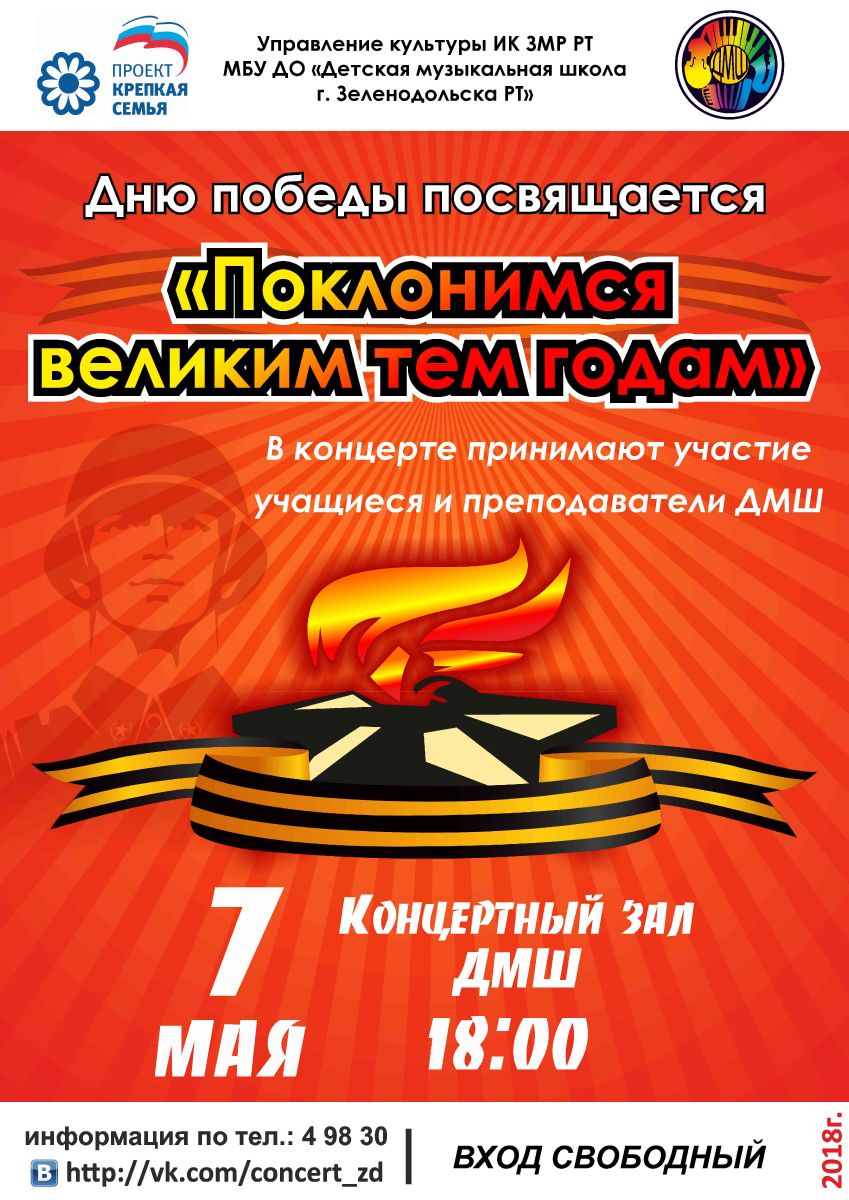 Опубликовано: 16.04.20187 мая 2018 года в Концертном зале ДМШ состоится концерт посвященный ДНЮ ПОБЕДЫ "Поклонимся великим тем годам". В концерте принимают участие учащиеся и преподаватели ДМШ. Начало в 18.00. Вход свободный. Информация по телефону: 4-98-30.