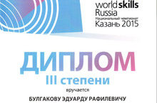Студент ЗМК Булгаков Эдуард занял III место в национальном чемпионате world skills Russia 2015, который прошёл в г.Казань с 19-23 мая 2015 г.