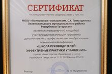 Гимназиябез "Җитәкчеләр мәктәбе: идарә итүнең нәтиҗәле практикалары" өстәмә һөнәри белем бирү программасын тормышка ашыруда катнашучы стажировка мәйданчыгы булуыбыз турында сертификат алды!