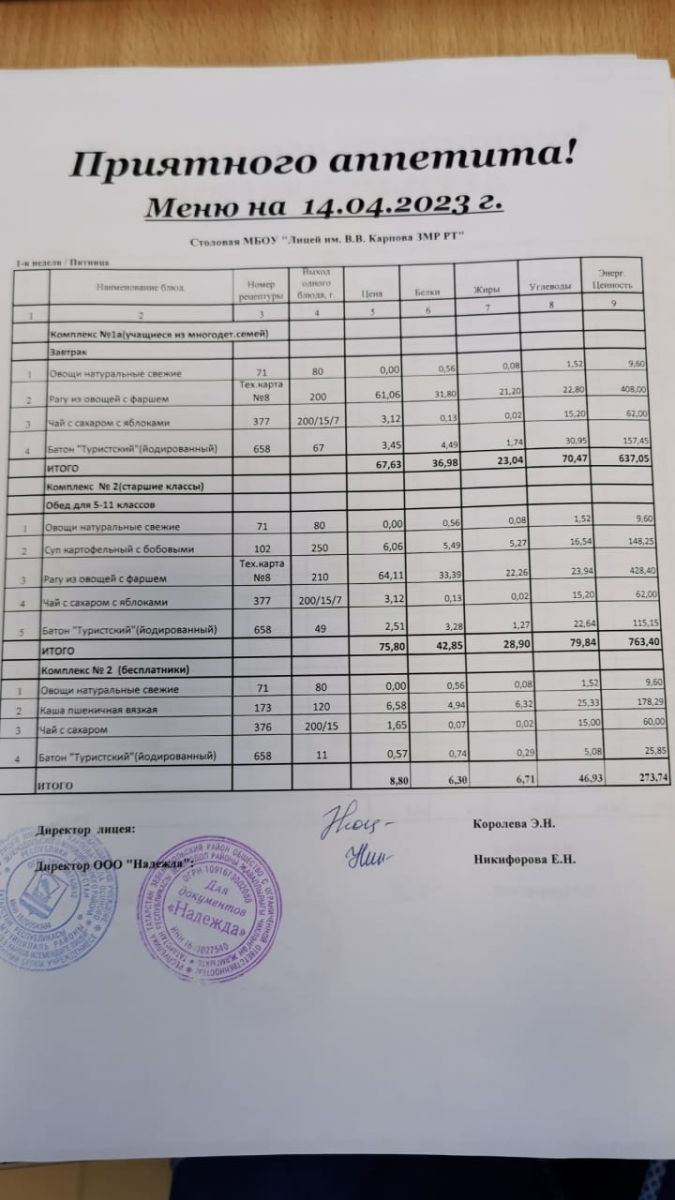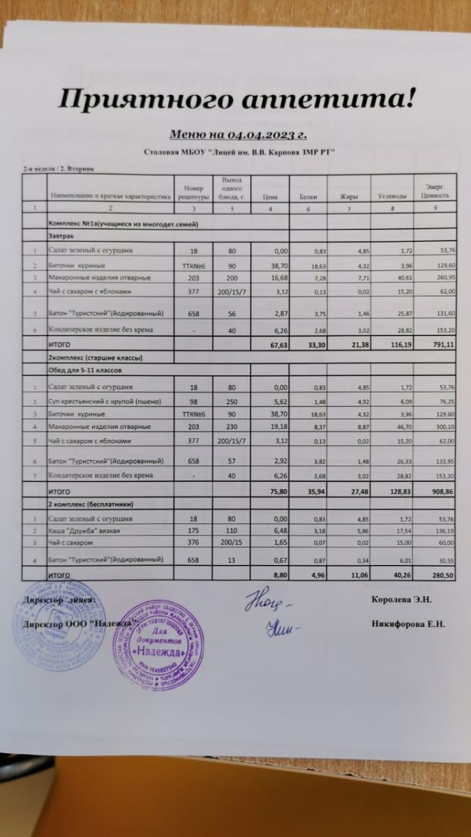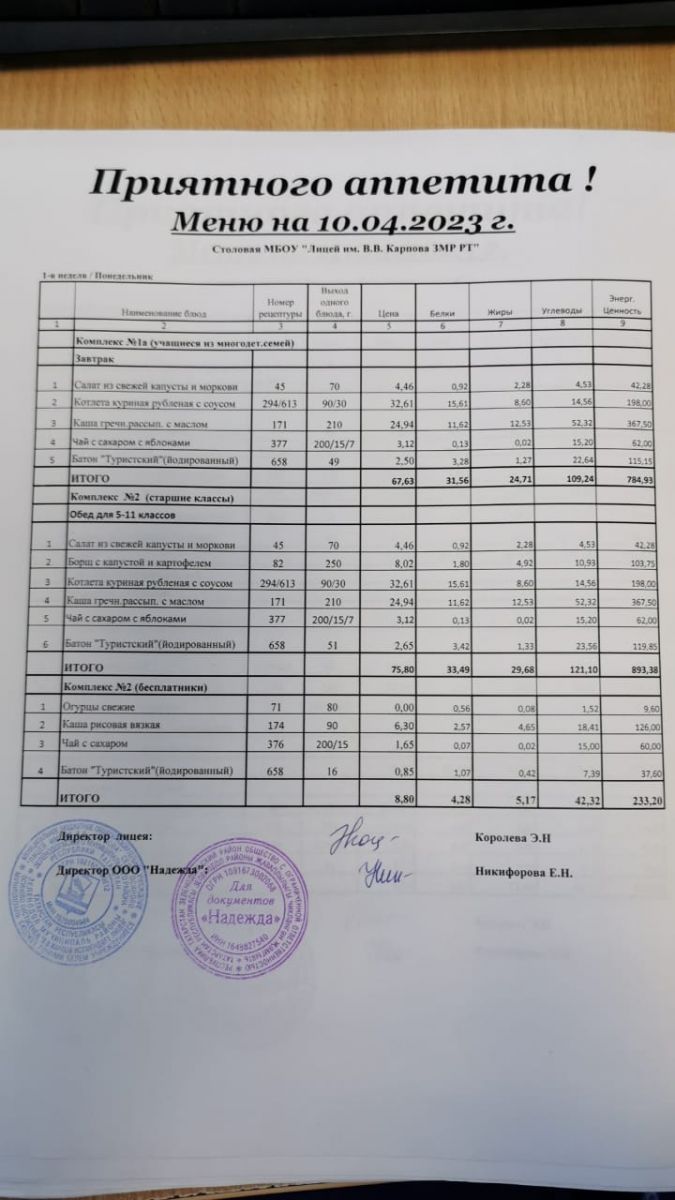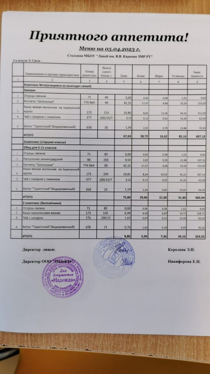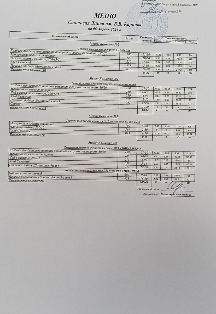 меню для учащихся 5-11 классов, многодетных, бесплатников апрель |
