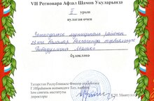 Сегодня в 5 гимназии г. Зеленодольска состоялся заключительный этап VII межрегиональных Афзал Шамовских чтений. На этом этапе конкурса известные личности наградили ребят почетными местами. Среди них методист по национальному образованию и межрегиональному сотрудничеству информационно- методического отдела УО ИК ЗМР РТ - Салахова Роза Абраровна, наставник - руководитель Всемирного конгресса татар, заслуженный учитель Татарстана - Мирхайдарова Альфия Хабировна, Руководитель Всемирного отделения Исполкома Всемирного конгресса татар Зиятдинова Гульнур Раисовна, татарский поэт, член Союза писателей Татарстана., Лауреат республиканской премии имени Мусы Джалиля, лауреат премии имени Намыка Кемаля Союза писателей Турции Рифат Салах, татарский поэт, журналист, член Союза журналистов РФ, Союза журналистов и писателей Татарстана, заслуженный деятель искусств Республики Татарстан, главный редактор Татарского книжного издательства Ленар Шаех. В 5 номинациях данного конкурса было принято 134 работы. Наша Гибадуллина Малика заняла достойное 2 место! Молодец!
