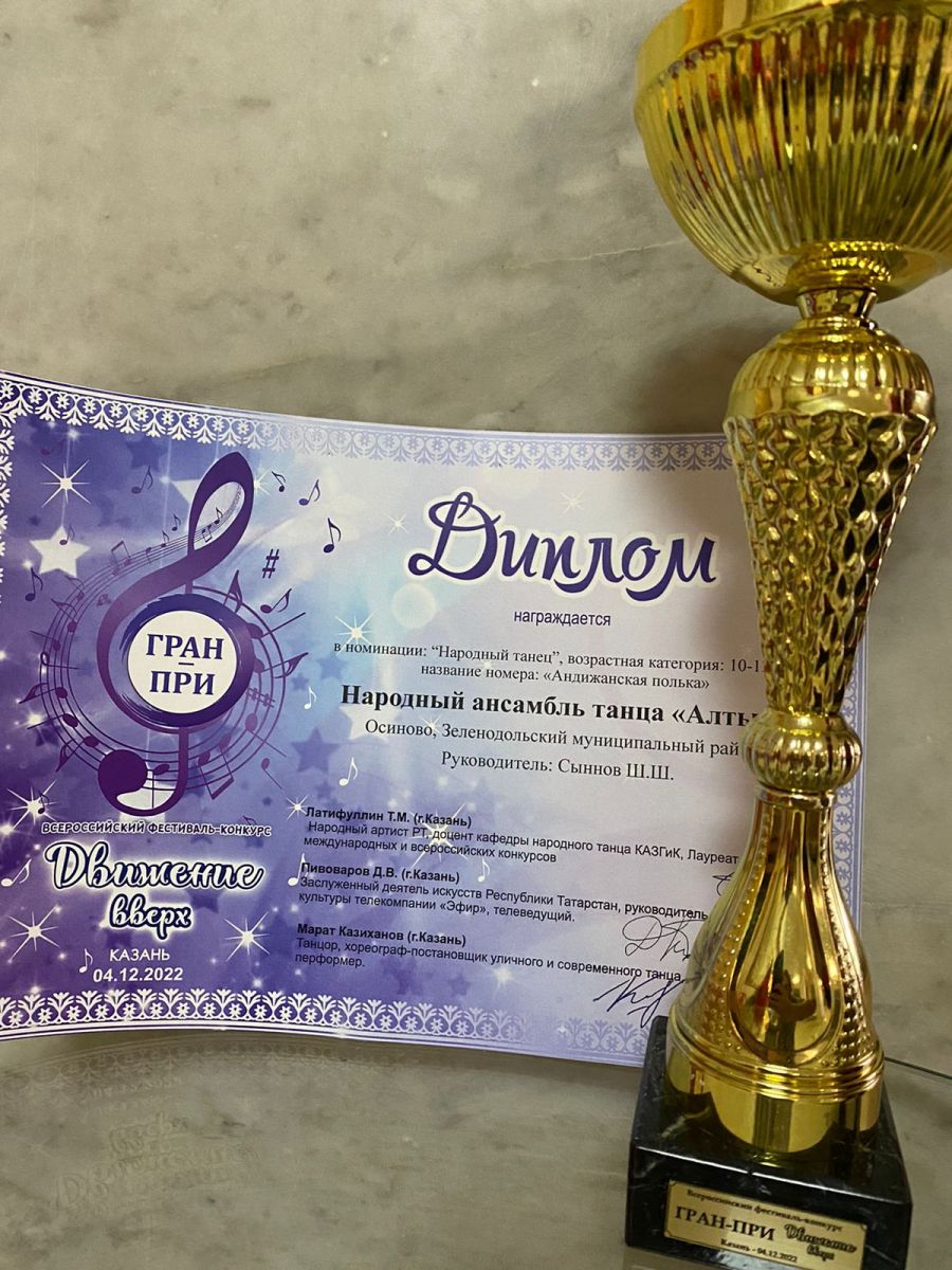 4 декабря 2022 года в Казани в ДК имени Ленина прошёл Всероссийский фестиваль-конкурс «Движение вверх». За высокое исполнительское мастерство единогласно членами жюри было решено присудить самую высокую награду фестиваля объединению «Алтын»: ГРАН-ПРИ удостоился танец «Андижанская полька»!!! /upload/storage/org986/files/Движение 2022 1.jpeg /upload/storage/org986/files/Движение 2022 2.jpeg /upload/storage/org986/files/Движение 2022 3.jpeg /upload/storage/org986/files/Движение 2022 4.jpeg