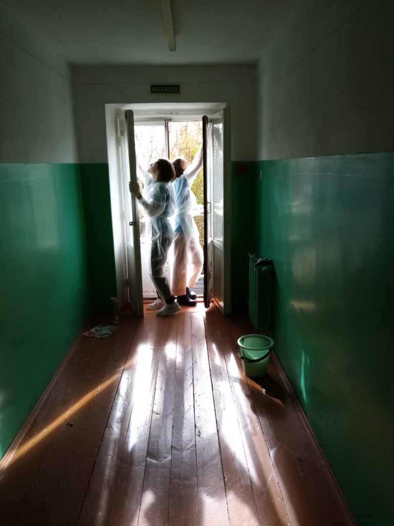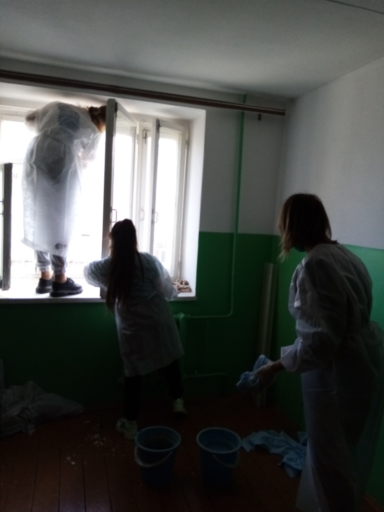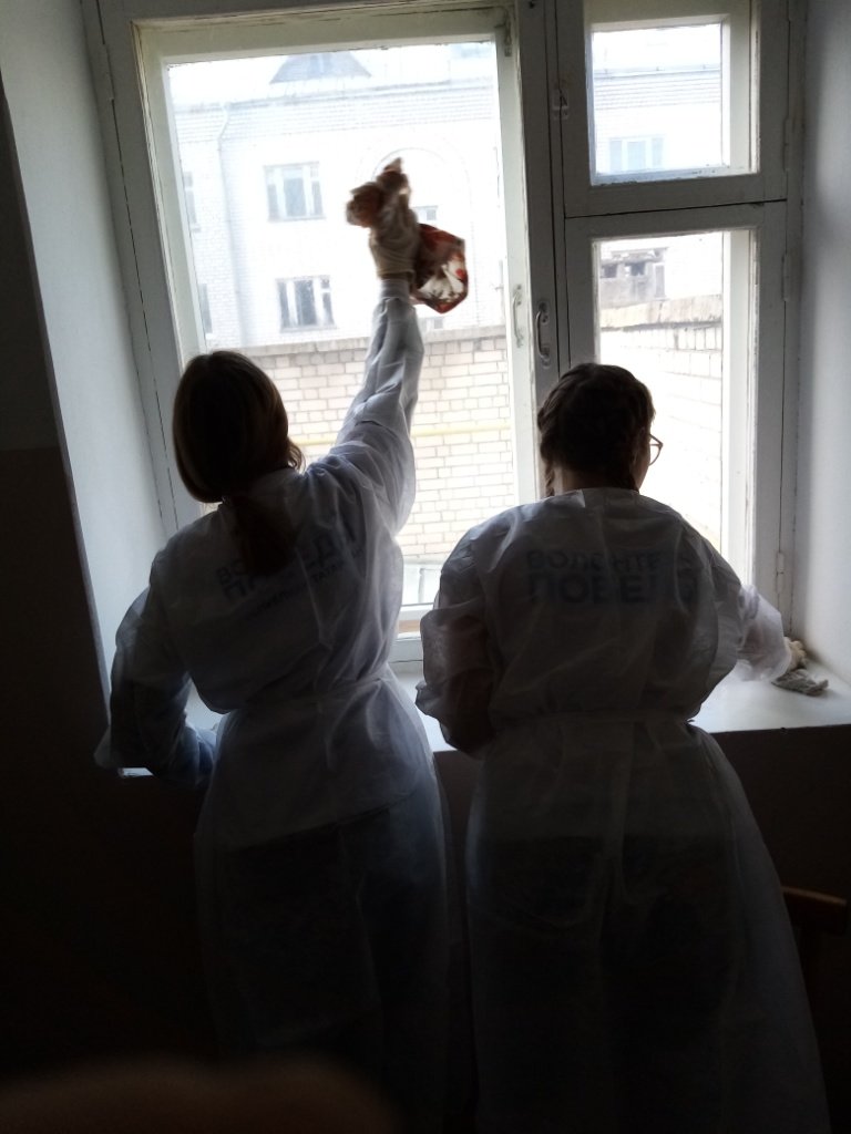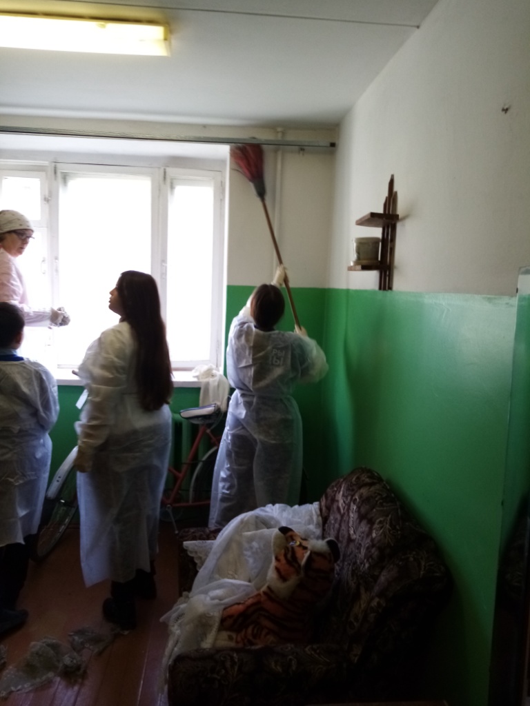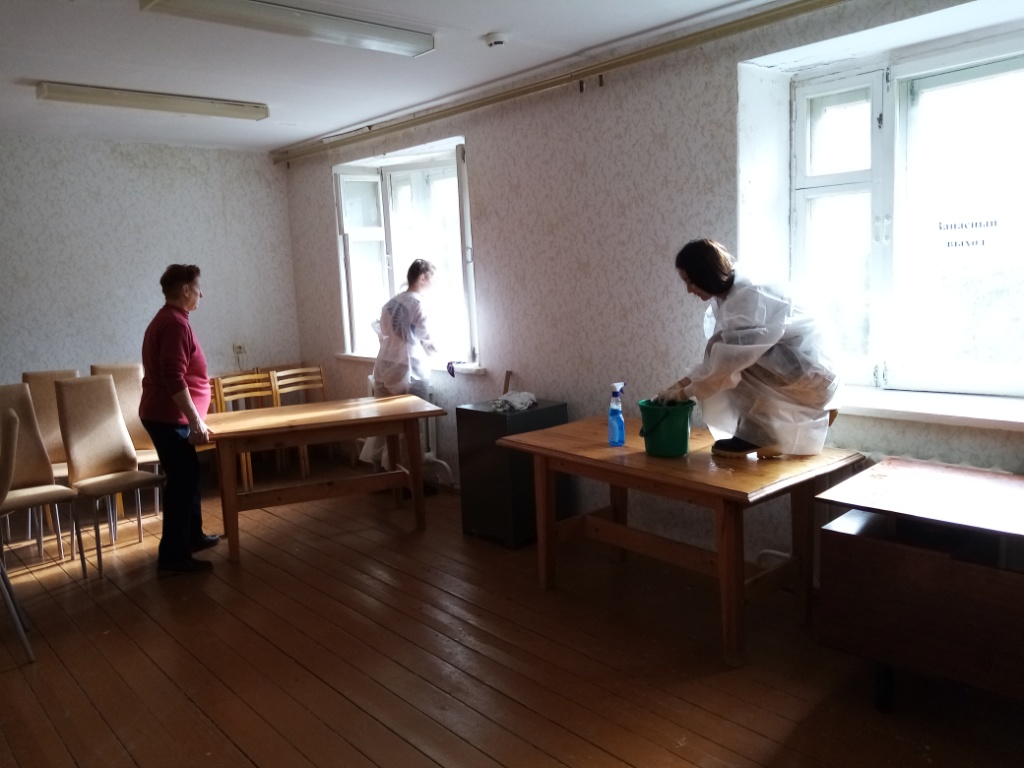 6 октября 2021 года провели уборку в Доме «Ветеран», помыли окна, развесили занавески.