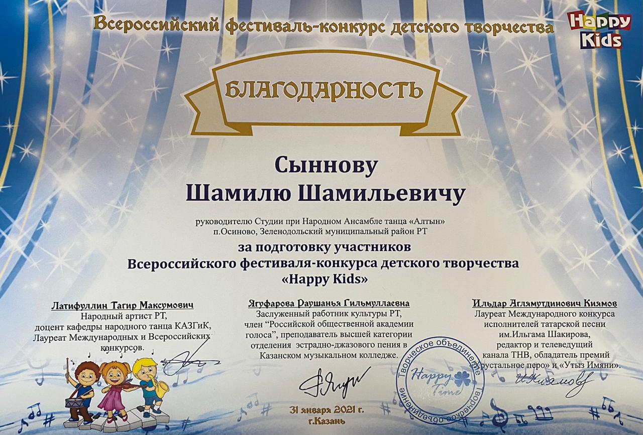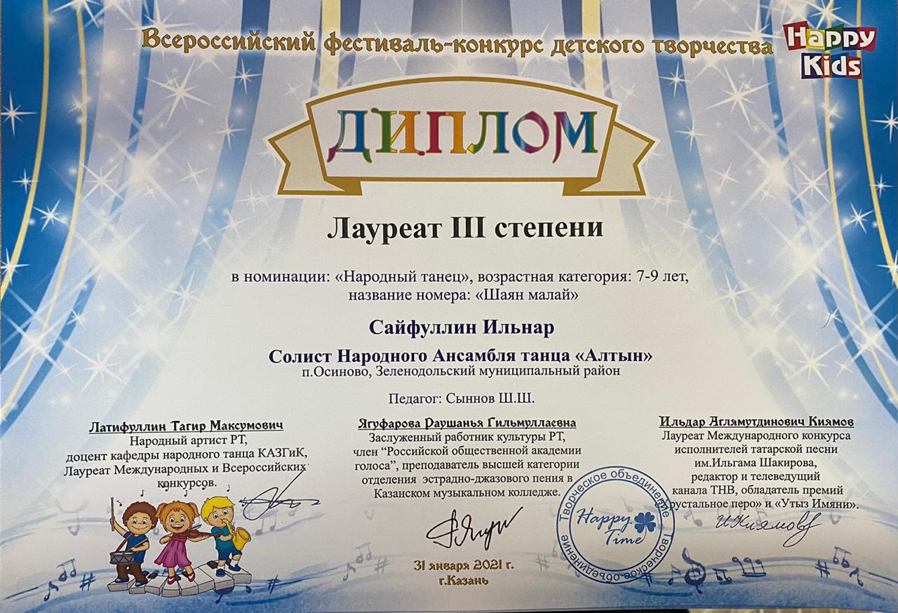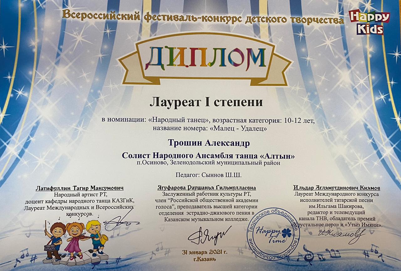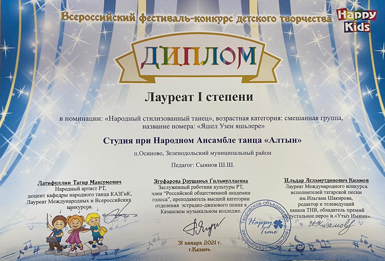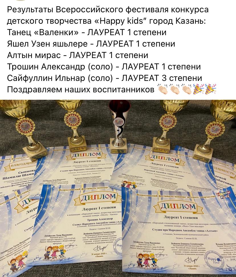 Всероссийский фестиваль-конкурс детского творчества “Happy kids”, проходивший в г.Казани 31 января 2021 года, оказался как всегда успешным для трудолюбивых и талантливых учащихся из ансамбля народного танца объединения «Алтын»!
