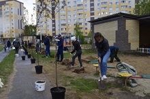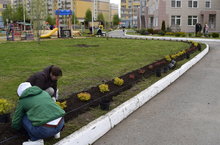 Продолжается благоустройство детского сада. В качестве живой изгороди были высажены 150 кустов японской спиреи.