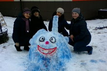 Воспитатели детского сада решили порадовать своих воспитанников героями мультсериала "Смешарики". Снежные герои: Крош, Нюша, Каркарыч, Копатыч, Бараш и Лосяш встречают ребятишек у центрального входа в детский сад.