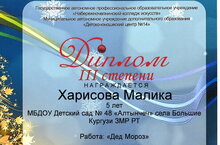 Воспитанница старшей группы нашего детского сада Харисова Малика участвовала в Региональном конкурсе рисункой " Сияй Новый год!"
