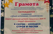 Дети группы № 3 (воспитатель Гараева В.З.) награждены грамотой исполнительного комитета ЗМР РТ в номинации "Лучшее исполнение строевой песни" в смотре-конкурсе стрроя и песни среди воспитанников дошкольных образовательных оргакнизаций и учащихся первых классов школ.