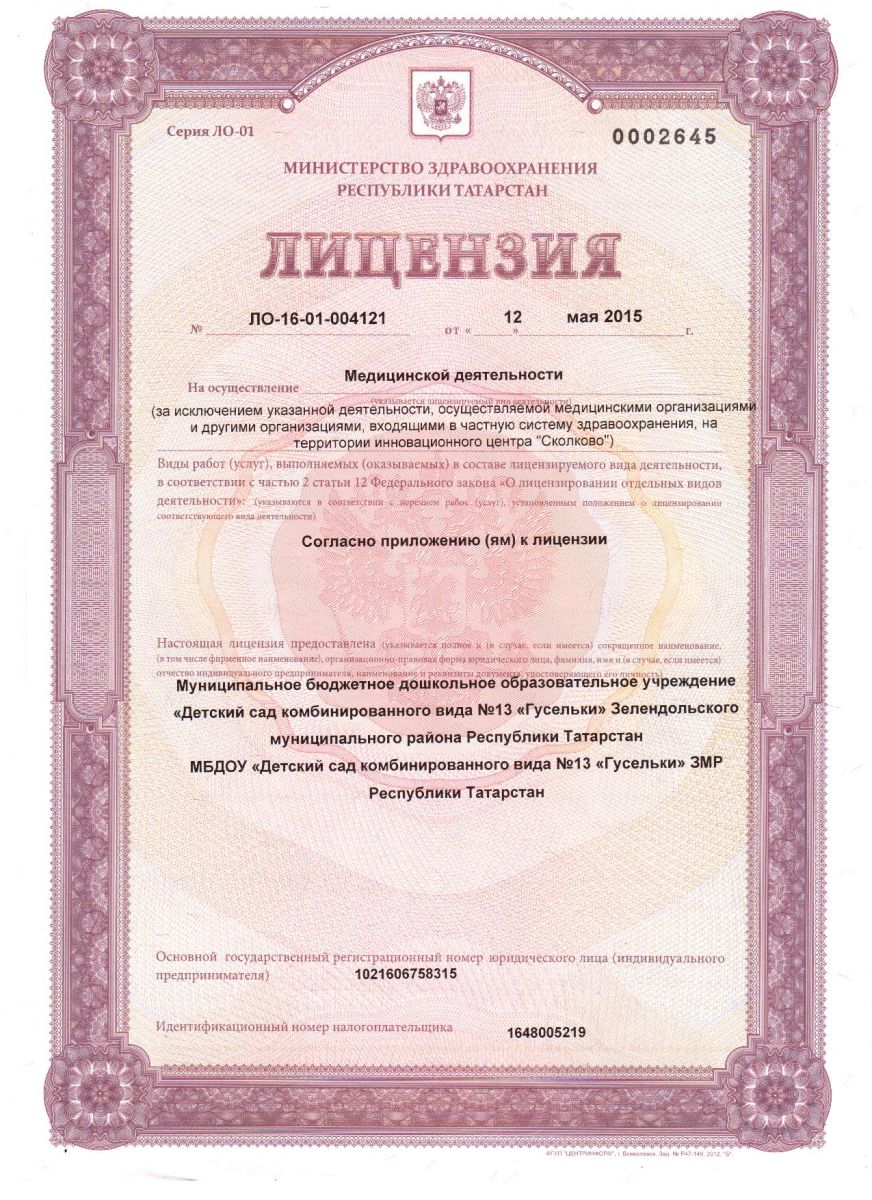 Министерством образования и науки Республики Татарстан выдана Лицензия на осуществление образовательной деятельности № 7510 25 ноября 2015 г. серия 16 Л 01 №0003458 Муниципальному бюджетному дошкольному образовательному учреждению «Детский сад комбинированного вида №13 «Гусельки» Зеленодольского муниципального района Республики Татарстан» на право оказывать образовательные услуги по реализации образовательных программ по видам образования, по уровням образования, по профессиям, специальностям, направлениям подготовки (для профессионального образования), по подвидам дополнительного образования Общее образование - Уровень образования - Дошкольное– Дополнительное образование – Дополнительное образование детей и взрослых