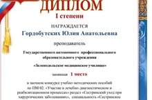 Поздравляем с победой!!! 25.02.2021 Поздравляем преподавателя Гордобутских Юлию Анатольевну с победой в заочном конкурсе учебно-методических пособий по ПМ 02. "Участие в лечебно-диагностическом и реабилитационном процессах" раздел "Сестринский уход при хирургических заболеваниях" специальность Сестринское дело. Конкурс проходил на базе ГБПОУ Республики Мордовия "Краснолободский медицинский колледж". Поздравляем!!!