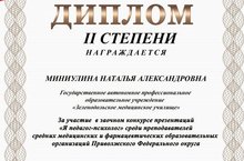 Поздравляем с призовым местом Минулину Наталью Александровну, психолога училища за участие в заочном конкурсе презентаций "Я педагог-психолог" среди преподавателей средних медицинских и фармацевтических образовательных организаций Приволжского Федерального округа.