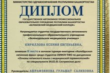 Призовое место в турнире-викторине 05.02.2020 Поздравляем студентку Кириллову Ксению Евгеньевну, занявшую III место в заочном турнире-викторине "Калейдоскоп латинских фраз" среди студентов СМОУ ПФО по дисциплине "Основы латинского языка с медицинской терминологией". Руководитель: Ашрафзянова Гульшат Салиховна.