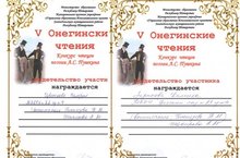 27 января 2015 года воспитанницы старшей группы Цветкова Валерия и Зарипова Камилла приняли участие на конкурсе чтецов поэзии А.С.Пушкина , который проходил на базе Лицея №9 им. А.С. Пушкина в рамках V Республиканских Онегинских чтений.