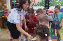 26 августа в детском саду прошло профилактическое мероприятие по правилам дорожного движения «Нам на улице не страшно!». В гостях у ребят была инспектор ОГИБДД ст.лейтенант полиции Леонтьева Юлия Игоревна. Она провела беседу с детьми старших групп, конкурс на знание ПДД, помогла ребятам вспомнить правила поведения на дороге и улице. Была сооружена импровизированная дорога со знаками, со светофором, с зеброй. В играх дети побывали и пешеходами, и пассажирами, и шофёрами. По окончании мероприятия в рамках акции «Светлячок» всем ребятам были вручены светоотражающие значки «ВНИМАНИЕ!!! Я ИДУ». Главная цель акции – сделать маленьких пешеходов заметными на проезжей части в темное время суток. В ходе социальной акции маленьким пешеходам напомнили о том, что дорога требует особого внимания и для чего нужен светоотражающий элемент и куда его лучше прикрепить.