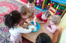 Малыши младшей группы изучали свойства снега в экспериментальной деятельности. Совместно с педагогом Борзовой Т.А. дети определяли цвет снега, затем каждый ребенок брал снег и смотрел, как он тает на ладошке и превращается в воду. Экспериментирование со снегом позволило детям сделать вывод, что снег холодный, а ладошка теплая — поэтому снег тает, снег белый, а вода прозрачная.
