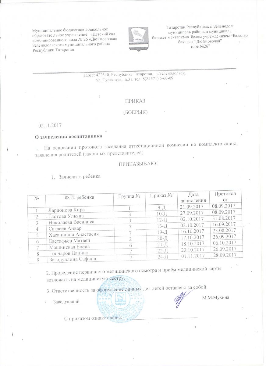 Приказ о приеме детей сентябрь. октябрь 2017 г.