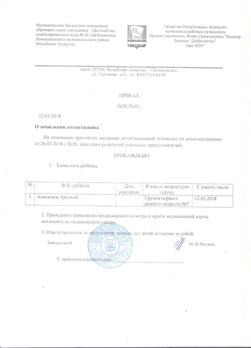 Приказ о зачислении - 12.03.2018 г.