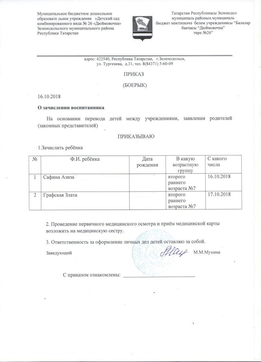 Приказ о зачислении от 16.10.2018 г
