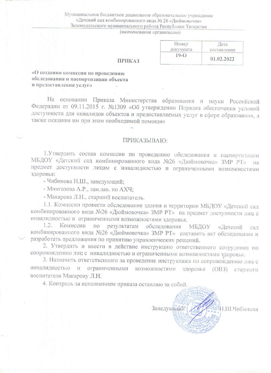 Приказ о создании комиссии по проведению обследования и паспортизации объекта