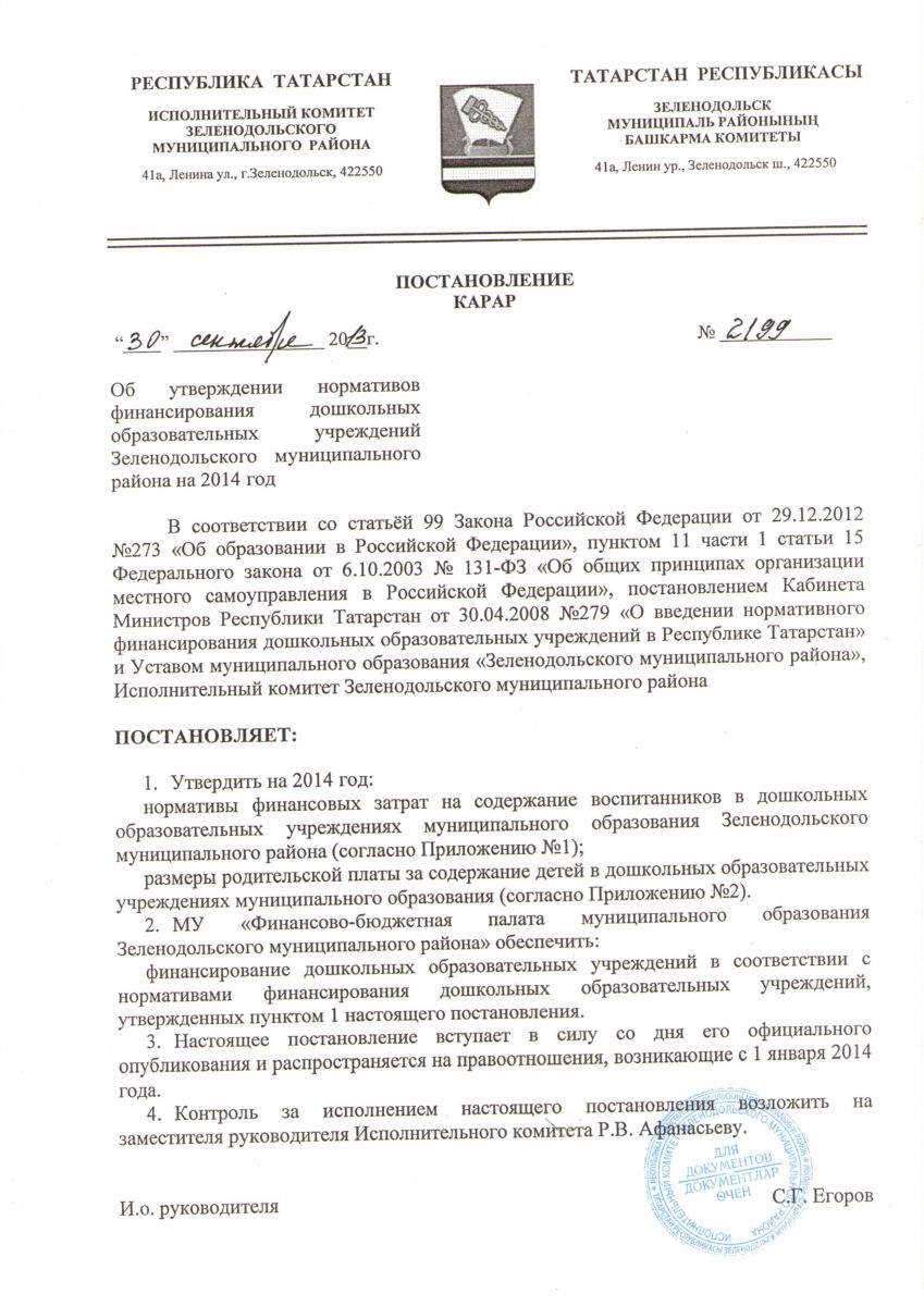 Постановление Исполнительного комитета ЗМР РТ от 30.09.2013г. № 2199 "Об утверждении нормативов финансирования дошкольных образовательных учреждений ЗМР на 2014 год"