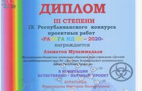 Азаматова Мөхәммәдали, тәрбияче Виноградова Виктория Валентиновна, җиңүче - 3 урын, "идеяләр Салават күпере-2020" IX Республика проект эшләре конкурсы дипломы белән котлыйбыз. Афәрин!!!