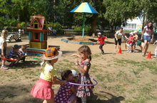 Согласно плана летней оздоровительной работы в детском саду прошел физкультурный досуг "Веселые эстафеты". Бегай, прыгай, улыбайся, жарким солнцем напивайся! Закаляйся! Будь здоров! И не надо докторов!