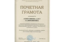 Поздравляем нашего старшего воспитателя Ахметзянову Алсу Салимзяновну с награждением почетной грамотой за весомый вклад в воспитание и обучение детей и многолетний добросовестный труд!!!