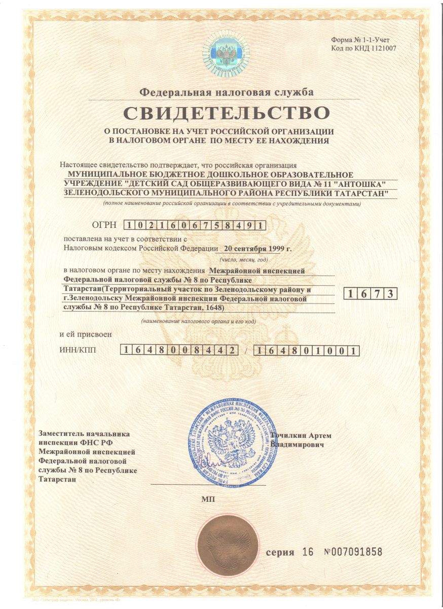 Свидетельство о постановке на учет в налоговом органе