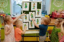 Ребята младшей группы в ожидании Новогоднего праздника на занятии по аппликации украшают свои зеленые ёлочки! -