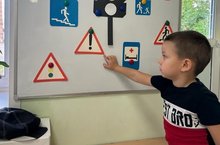 В первой остановке дети отгадывали загадки про дорожные знаки и находили их карточки. Во второй остановке ребят ждала полоса препятствий, через которую дети соревновались командами, прокатив машины за веревочку, не задевая расставленные кегли.
